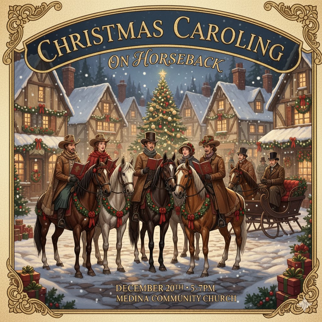 Home Events - Medina Community Church Community Events Family Featured Special Events Christmas Caroling on Horseback Christmas Caroling on Horseback + Add to Google Calendar + iCal / Outlook export Date Dec 20 2025 Time 5:00 pm - 7:00 pm Category Community Events Family Featured Special Events Share this event